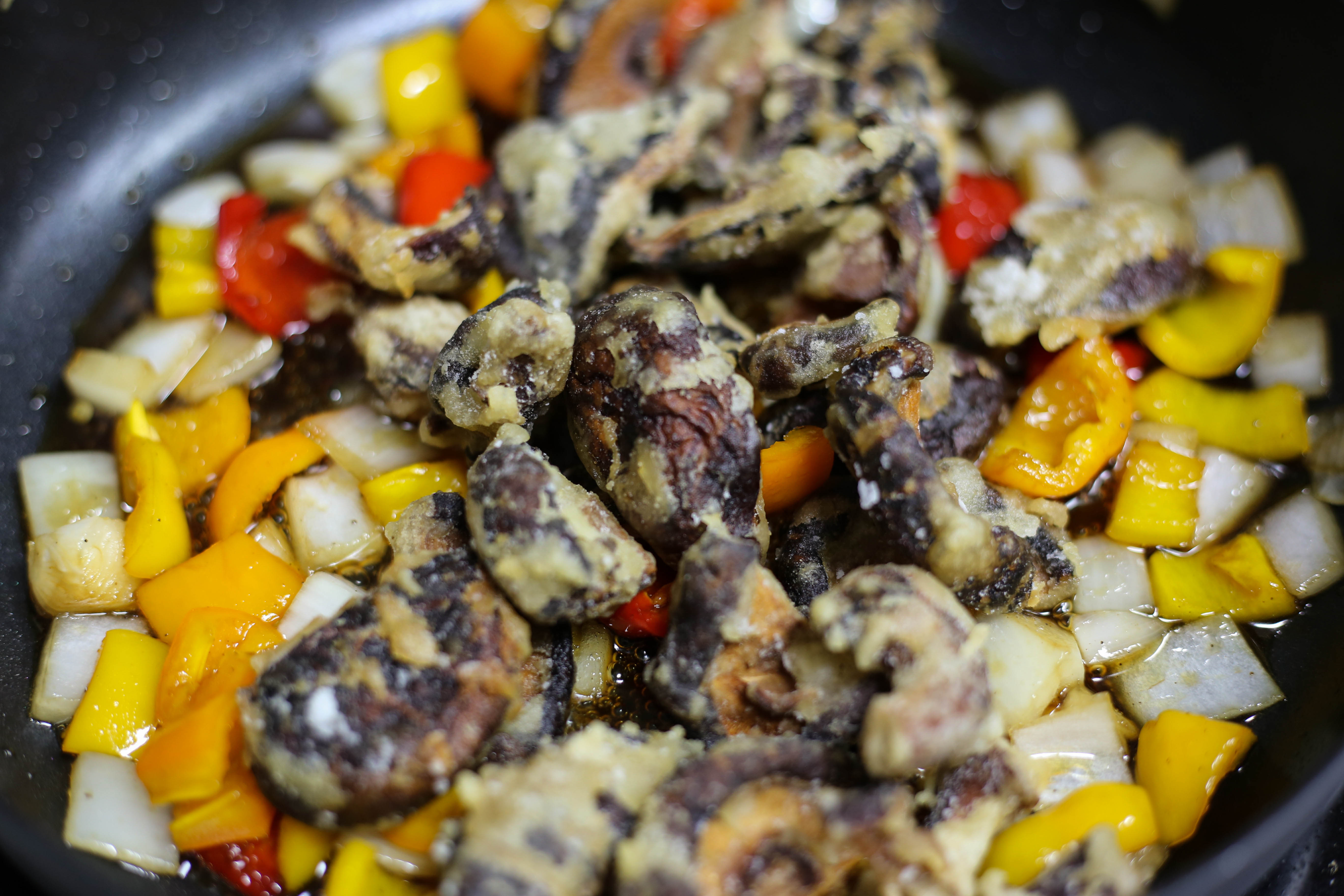 5. 튀긴 표고버섯을 넣고 재빨리 섞은 후 불을 끈다.