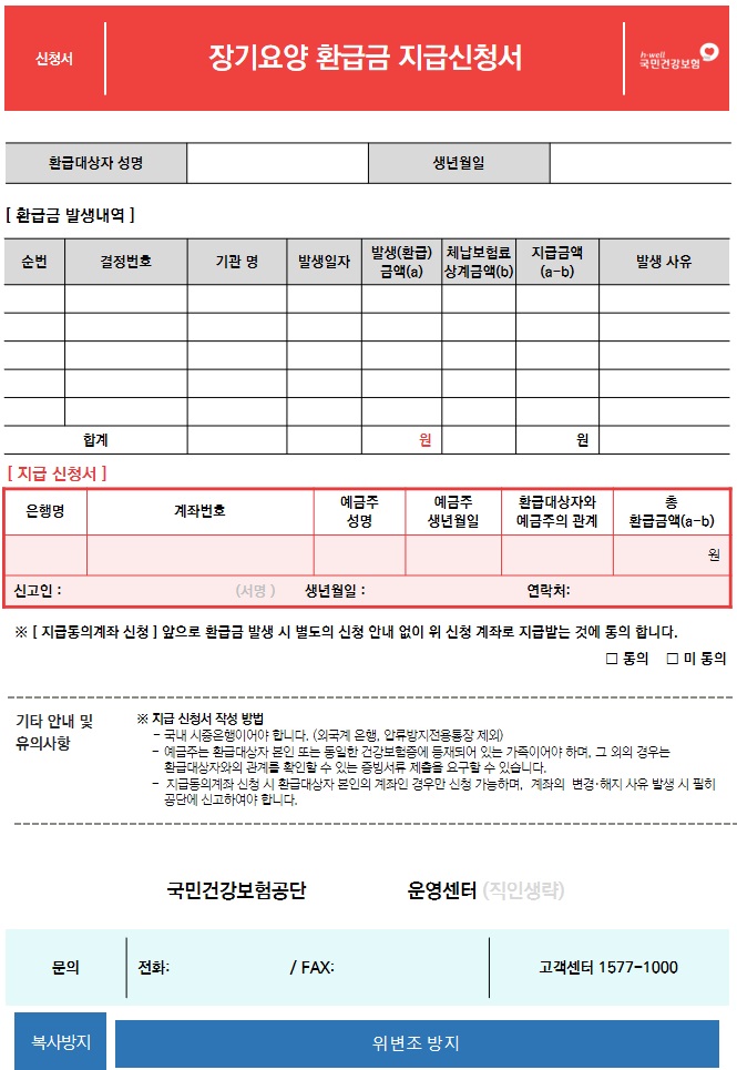 - 홈페이지: www.longtermcare.or.kr>민원상담실>장기요양 신청>본인 부담환급금 신청